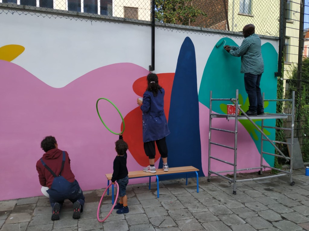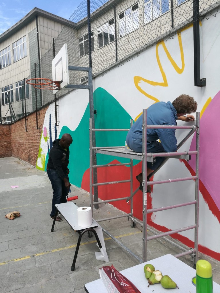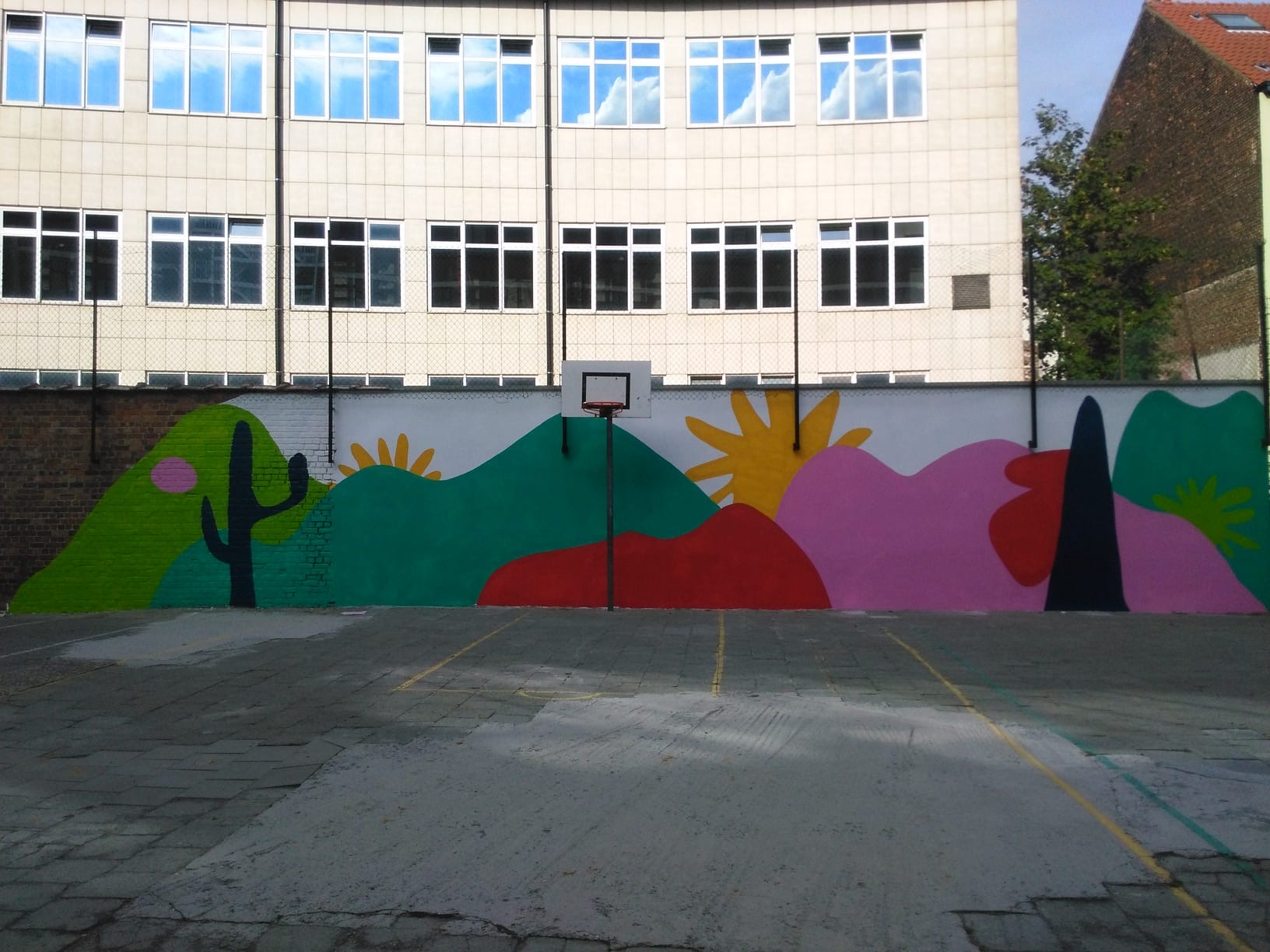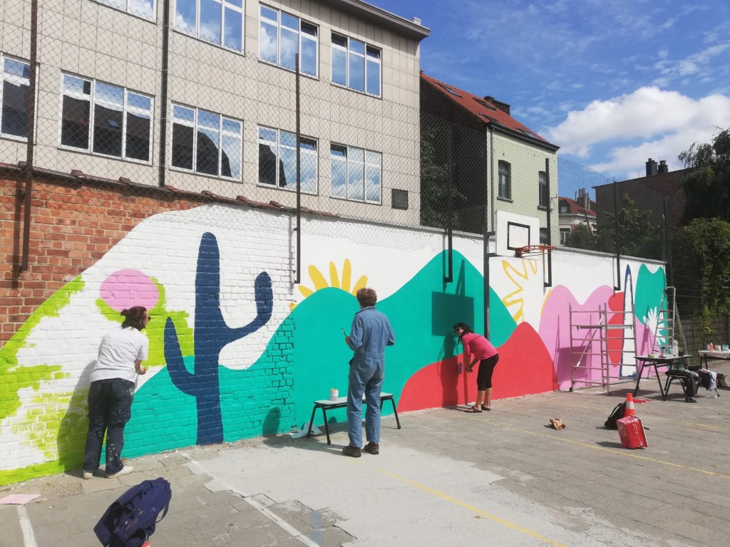 Eté 2019 : création d’une fresque et d’un mur d’escalade dans la cour de l’école