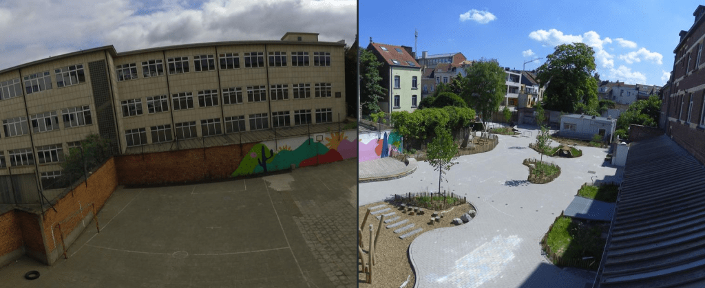 La cour de notre école était comme dans beaucoup d’école de Bruxelles, une cour bétonnée qui devenait un vrai four quand le soleil pointait son nez. Asphaltée, imperméable, pleine de flaques dès qu’il pleuvait, et dans laquelle les élèves n’avaient pas l’occasion d’être en contact avec la nature…On avait vraiment envie et besoin de mettre de la vie et de la couleur dans notre cour de récréation. De rendre la nature accessible à nos élèves, même en ville.